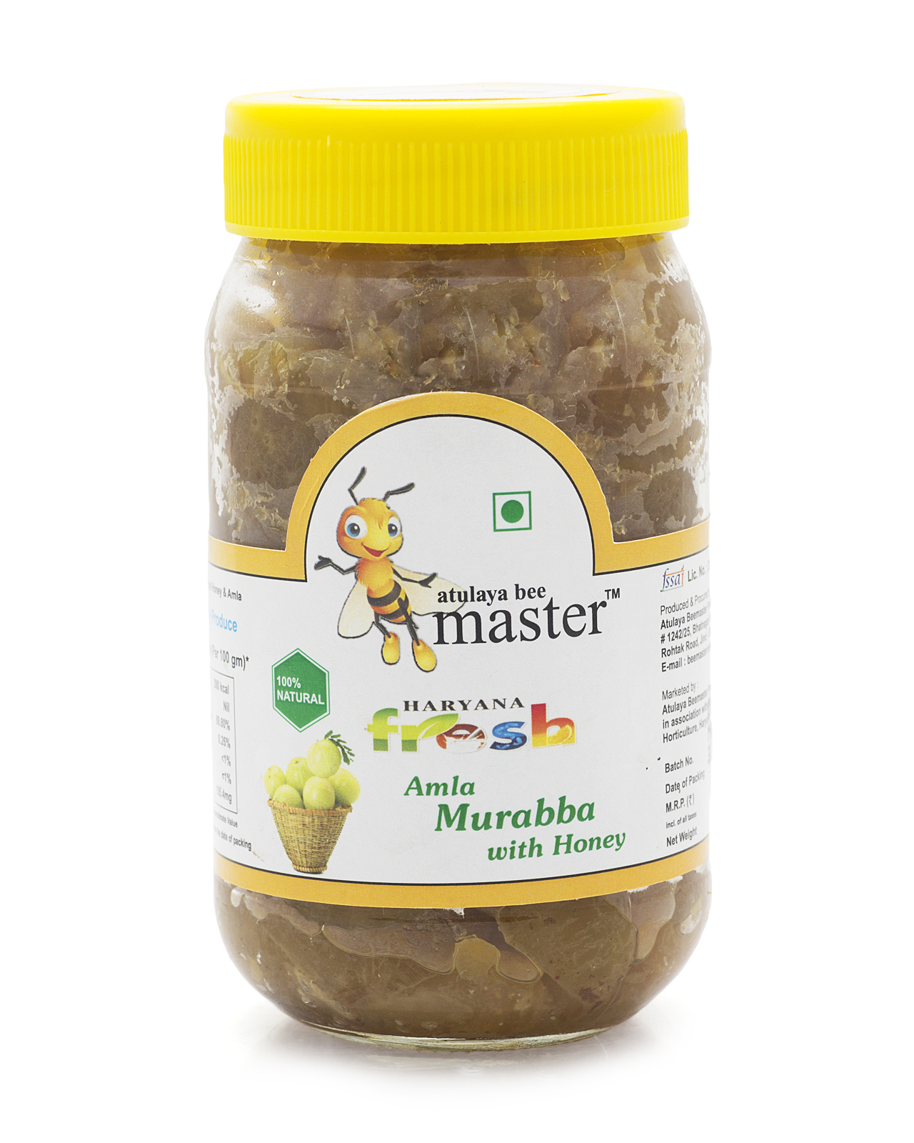 Haryana Fresh Amla Murabba with Honey from Atulaya Bee Master™ is a premium, 100% natural and organically produced Ayurvedic delicacy that combines pure natural honey with fresh Amla (Indian gooseberry) pieces to create a traditional murabba (preserve). Crafted by Atulaya Beemaster Producer Company Limited in Jind, Haryana, this product blends the tangy, vitamin-rich goodness of amla with the soothing sweetness of raw honey — resulting in a thick, chunky, greenish-brown jam-like preserve filled with soft, translucent amla pieces (as clearly visible in your jar image). It is completely natural, free from artificial colors, preservatives, or refined sugar, and carries the trusted Atulaya seal of purity and tradition.