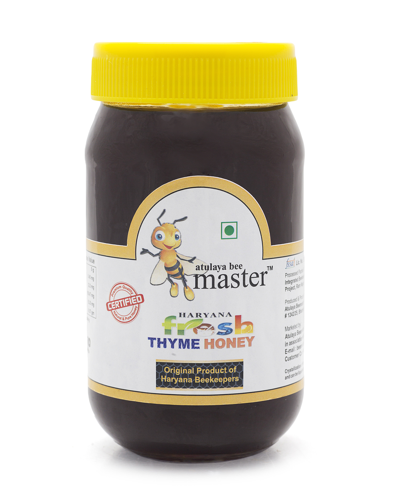 Haryana Fresh Thyme Honey from Atulaya Bee Master™ is a premium, 100% natural and pure monofloral honey sourced from the nectar of thyme flowers in the fields of Haryana, India. Produced and processed by Atulaya Beemaster Producer Company Limited in Jind, Haryana, through ethical beekeeping and integrated apiary projects, this honey is raw, unfiltered, and certified organic. It features a deep, rich amber color with a distinctive herbal, slightly savory aroma and flavor — less overtly sweet than regular honey, thanks to thyme’s unique thymol compounds.